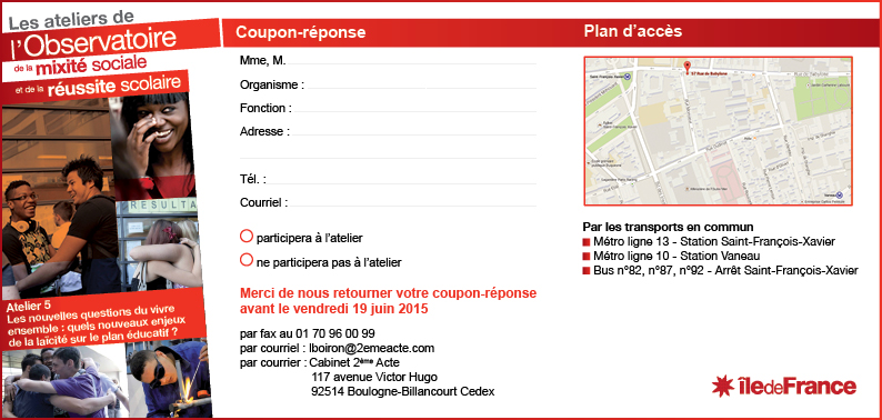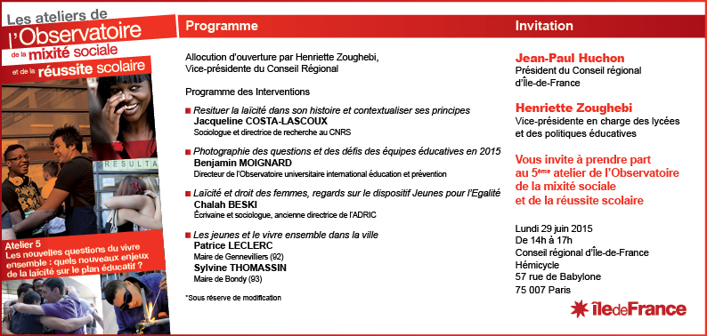 NOUVELLES QUESTIONS DU VIVRE ENSEMBLE : QUELS NOUVEAUX ENJEUX DE LA LAÏCITE SUR LE PLAN EDUCATIF ? – 5ème atelier de l’Observatoire de la mixité sociale et de la réussite scolaire – le 29 juin 2015 de 14 h à 17 h au CG d’Ile de France